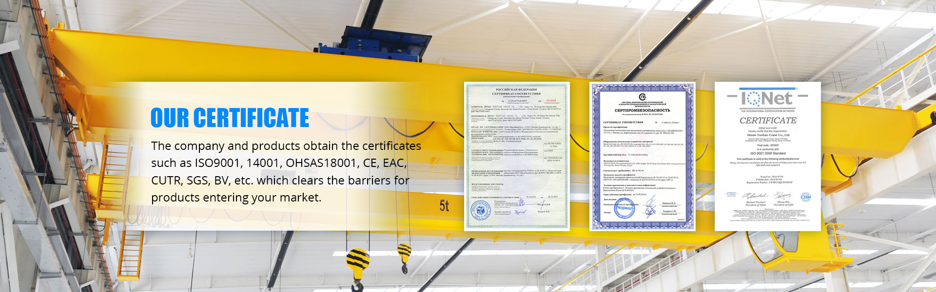 Mēs varam piedāvāt Jums visu veidu rūpniecības celtņus no 0,25 tonnas līdz 900 tonnām, nodot GB / T 19001-2000 IDT ISO 9001: 2000, GB / T 24001-2004 IDT ISO 14001: 2004, GB / T 28001-2001, OHSAS 18001: 1999, CE, GOST, SGS, TUV, BV un tā tālāk.